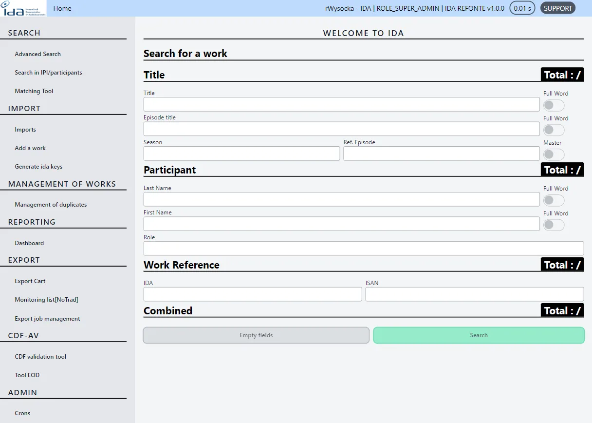 The International Documentation on Audiovisual works (IDA), is an international centralized database facilitating the identification of audiovisual works and rights holders. My job was to make a test book, set up browser tests. modify their CI/CD. In addition to adding support in Front-end development.