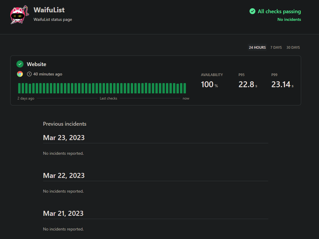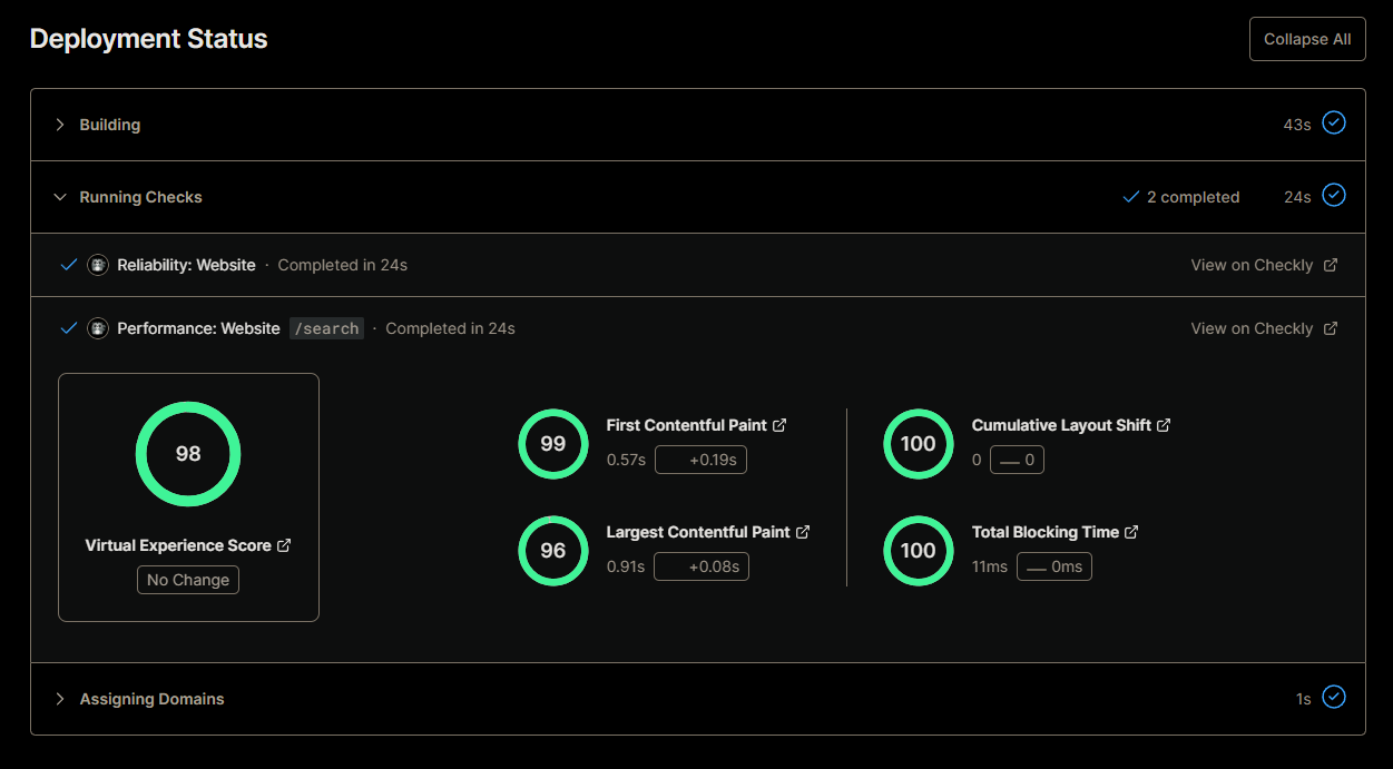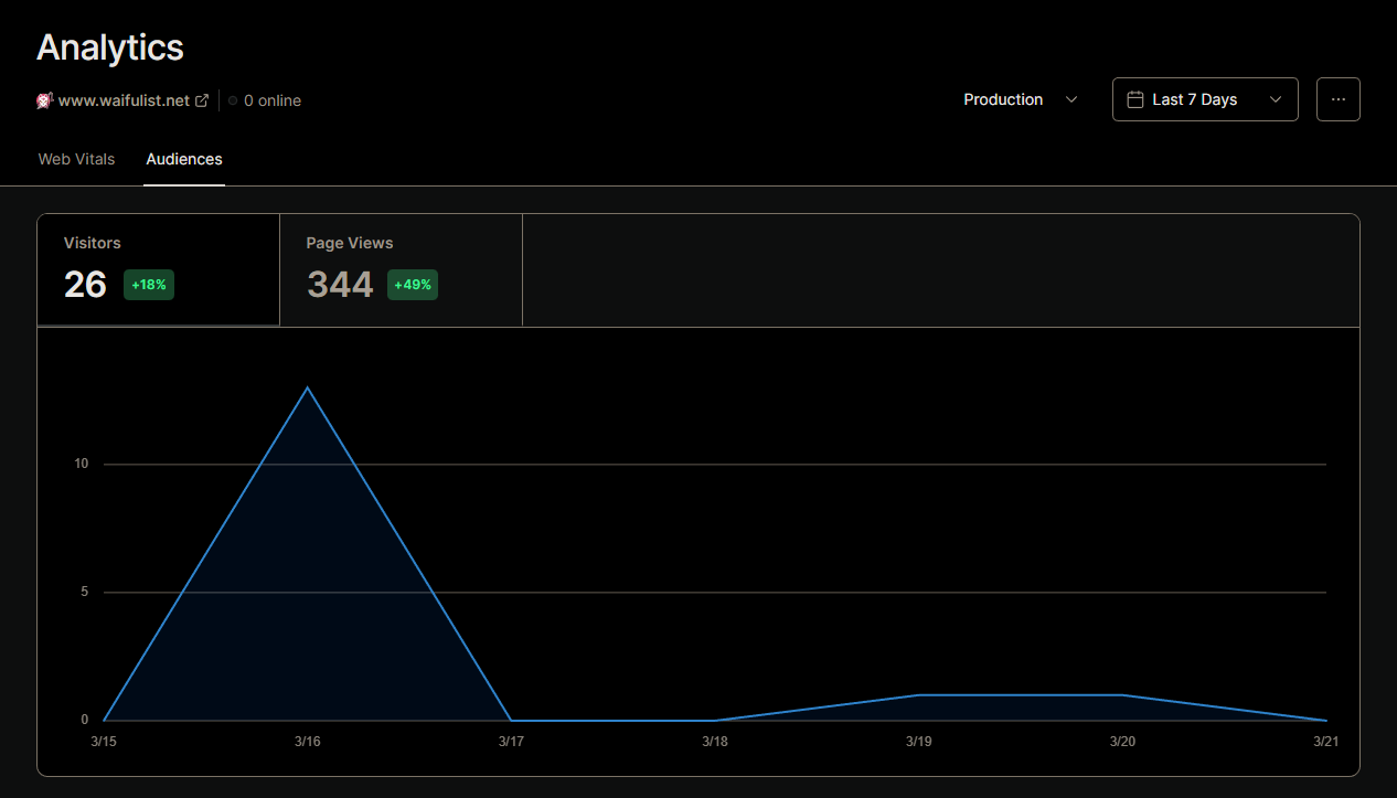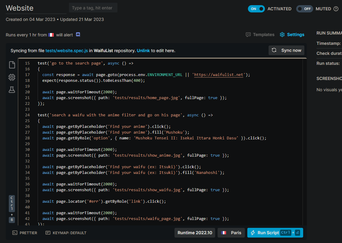 Mise en production : Vercel a été utilisé pour déployer et mettre en production le site WaifuList. Avant chaque déploiement, Vercel permet de lancer et vérifier les browser tests de Checklyhq pour s'assurer de leur bon fonctionnement. De plus, Vercel fournit des résultats de performance à la fin de chaque déploiement, facilitant ainsi le suivi et l'optimisation des performances du site.