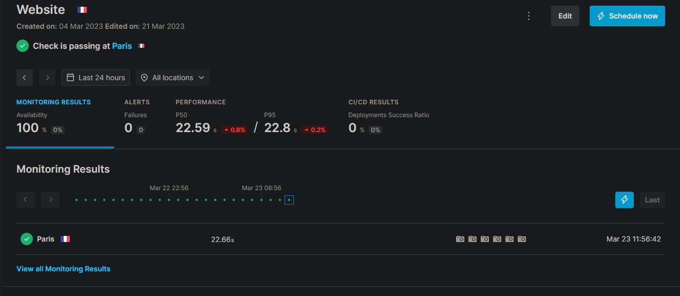 Browser test : Checklyhq a été utilisé pour effectuer des tests de navigateur afin de simuler l'activité des utilisateurs, offrant ainsi des résultats proches de la réalité.