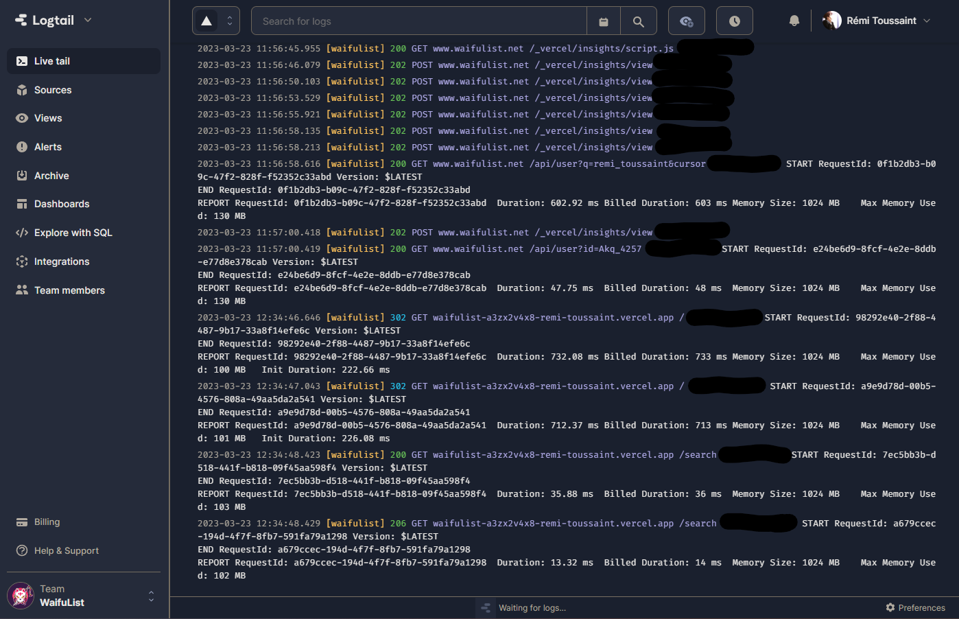 Gestion de logs : Logtail a été utilisé pour la gestion des logs et le suivi des incidents. Lorsqu'une erreur 500 (erreur provenant du serveur) se produit, une notification est envoyée dans un salon Discord dédié, permettant ainsi une réactivité accrue pour résoudre les problèmes potentiels.